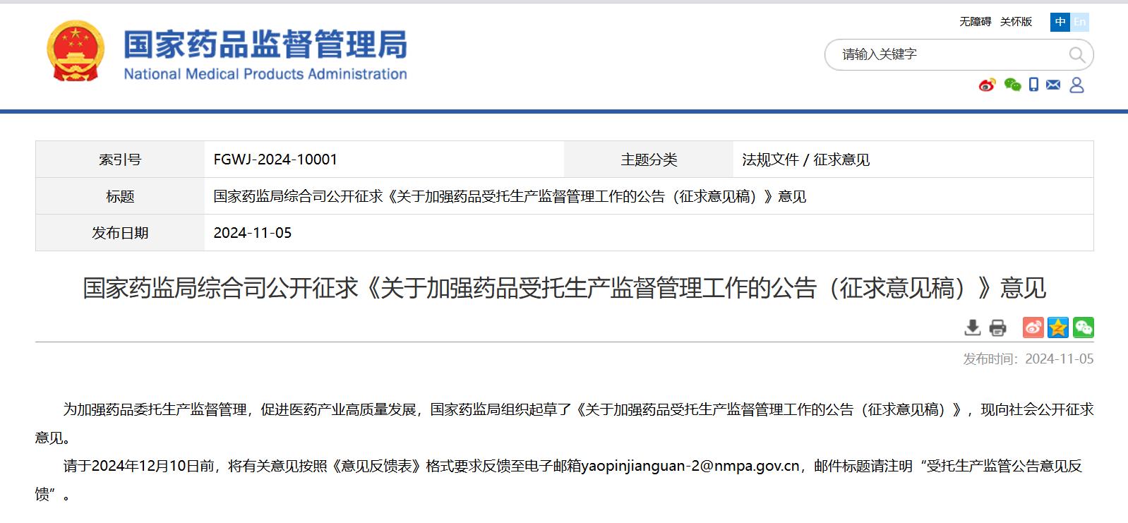 國(guó)家藥監(jiān)局綜合司公開征求《關(guān)于加強(qiáng)藥品受托生產(chǎn)監(jiān)督管理工作的公告(征求意見稿)》意見