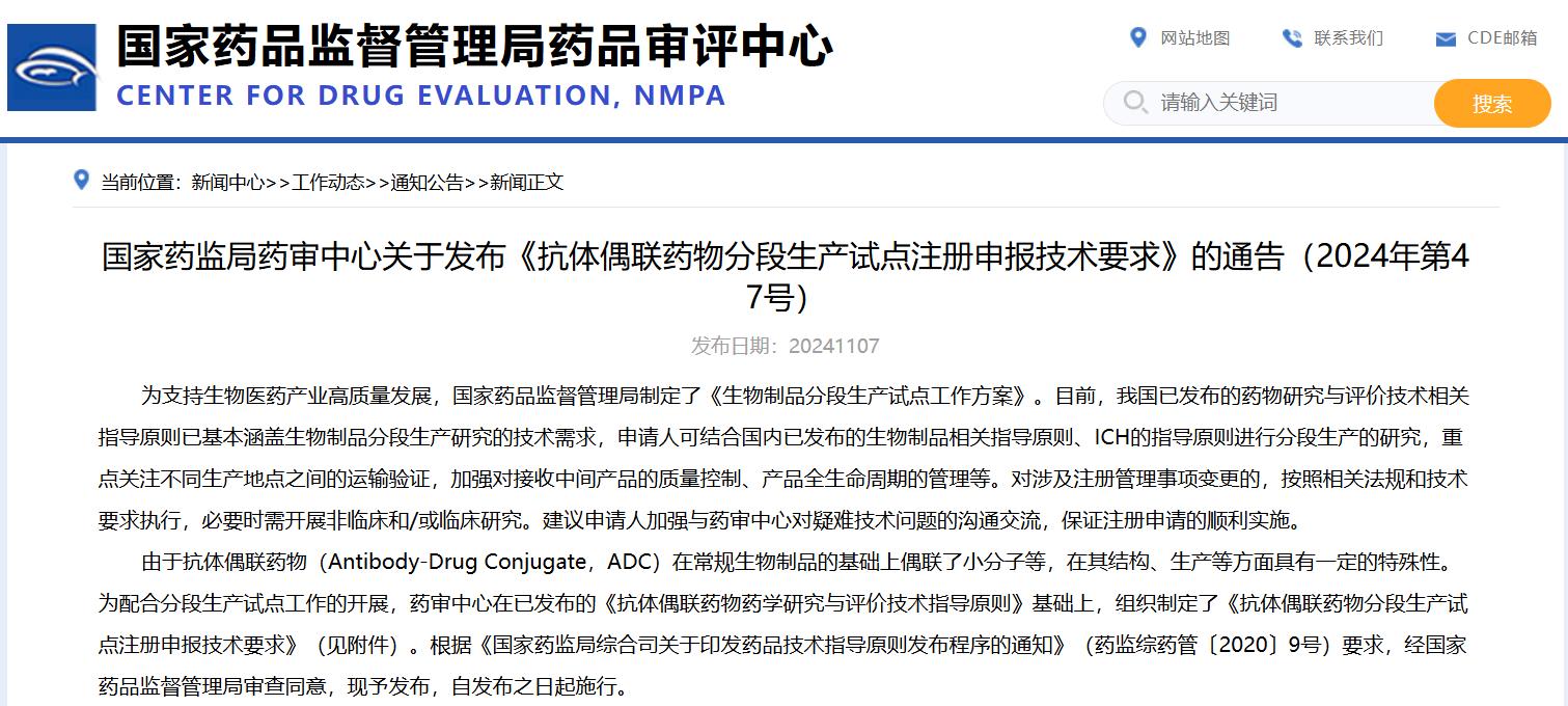 國(guó)家藥監(jiān)局藥審中心關(guān)于發(fā)布《抗體偶聯(lián)藥物分段生產(chǎn)試點(diǎn)注冊(cè)申報(bào)技術(shù)要求》的通告(2024年第47號(hào))