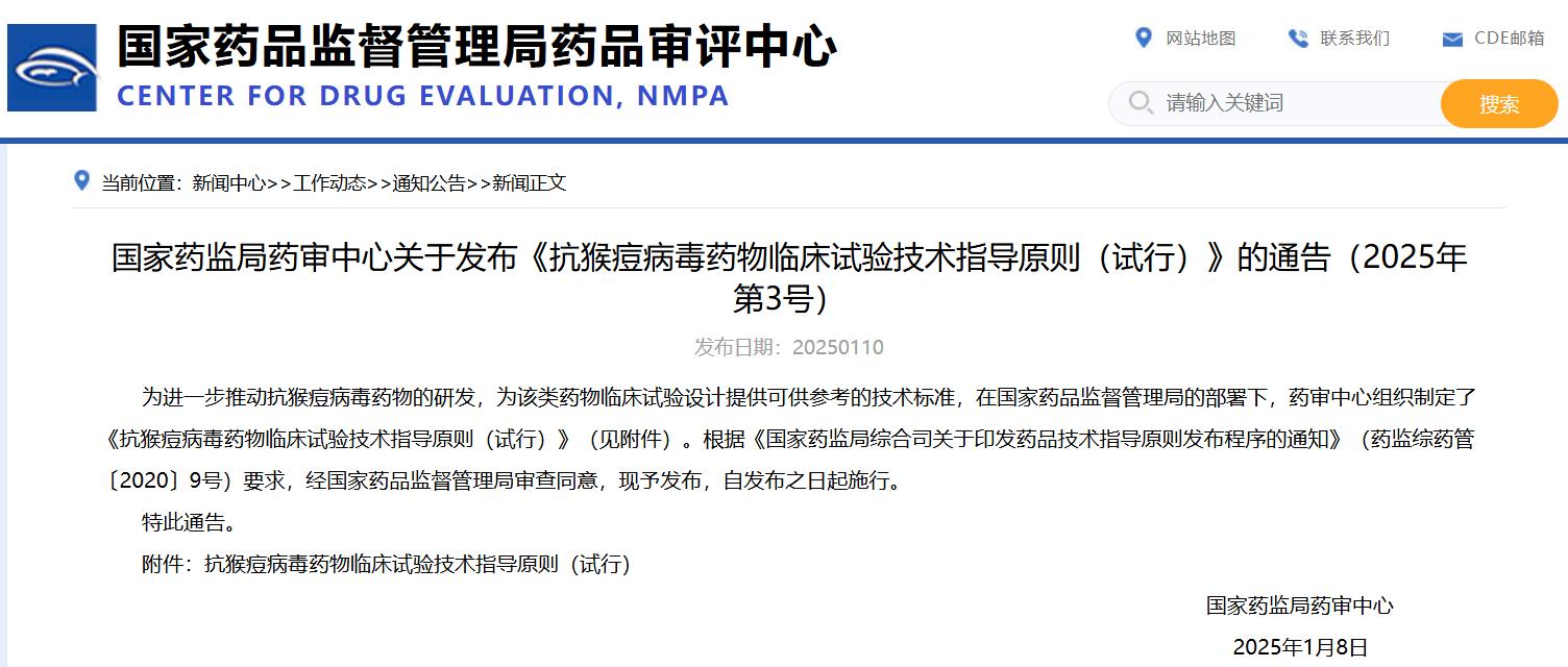 國(guó)家藥監(jiān)局藥審中心關(guān)于發(fā)布《抗猴痘病毒藥物臨床試驗(yàn)技術(shù)指導(dǎo)原則(試行)》的通告(2025年第3號(hào))