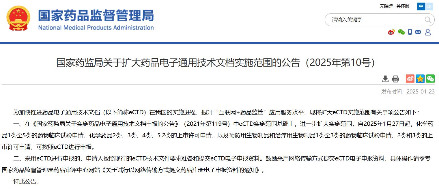 國家藥監(jiān)局關(guān)于擴(kuò)大藥品電子通用技術(shù)文檔實施范圍的公告(2025年第10號)