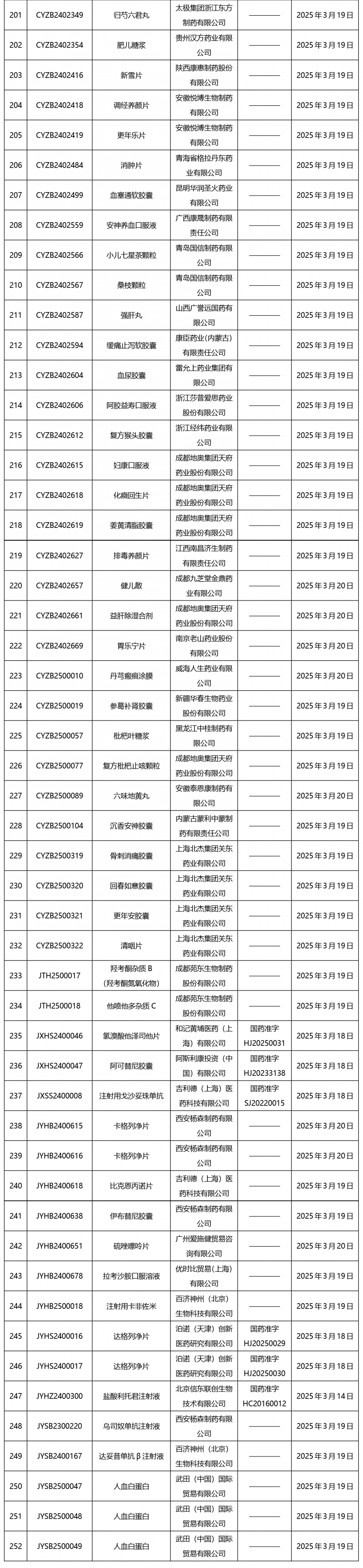 截止2025年3月21日15:00本周發(fā)布252個(gè)待領(lǐng)取藥品批準(zhǔn)證明文件,其中注射液59個(gè),一致性評(píng)價(jià)品種13個(gè)。