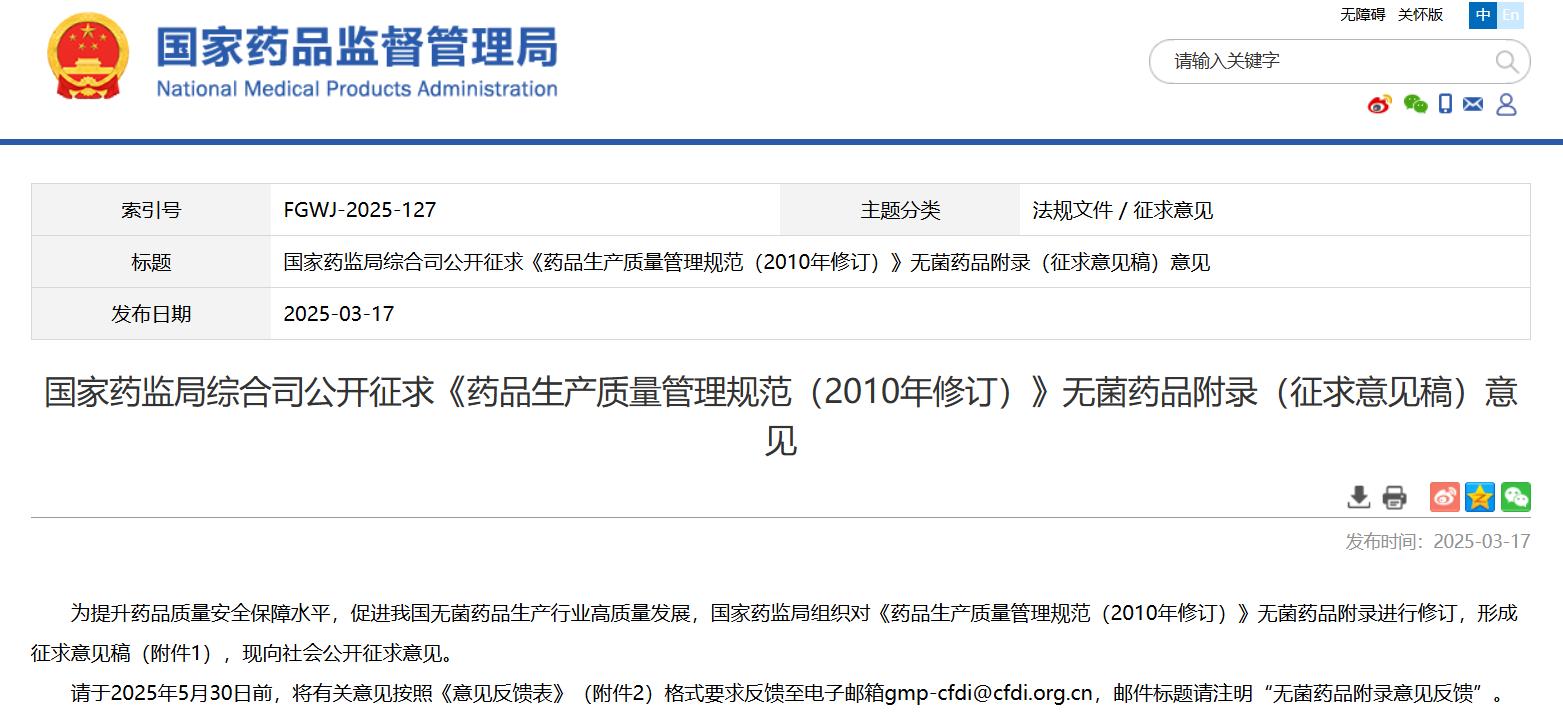 國(guó)家藥監(jiān)局綜合司公開征求《藥品生產(chǎn)質(zhì)量管理規(guī)范(2010年修訂)》無(wú)菌藥品附錄(征求意見(jiàn)稿)意見(jiàn)