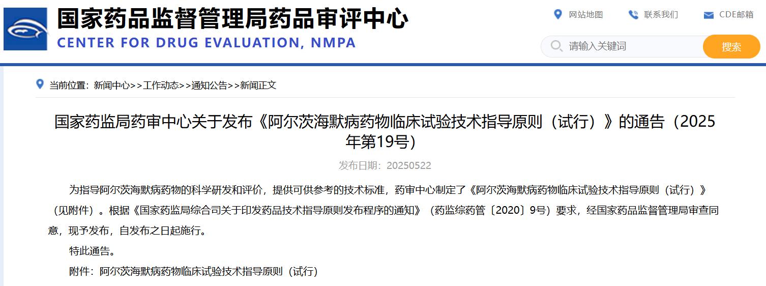 國家藥監(jiān)局藥審中心關于發(fā)布《阿爾茨海默病藥物臨床試驗技術(shù)指導原則(試行)》的通告(2025年第19號)