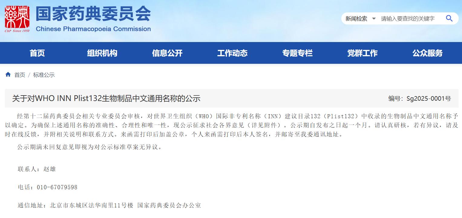 關于對WHO INN Plist132生物制品中文通用名稱的公示