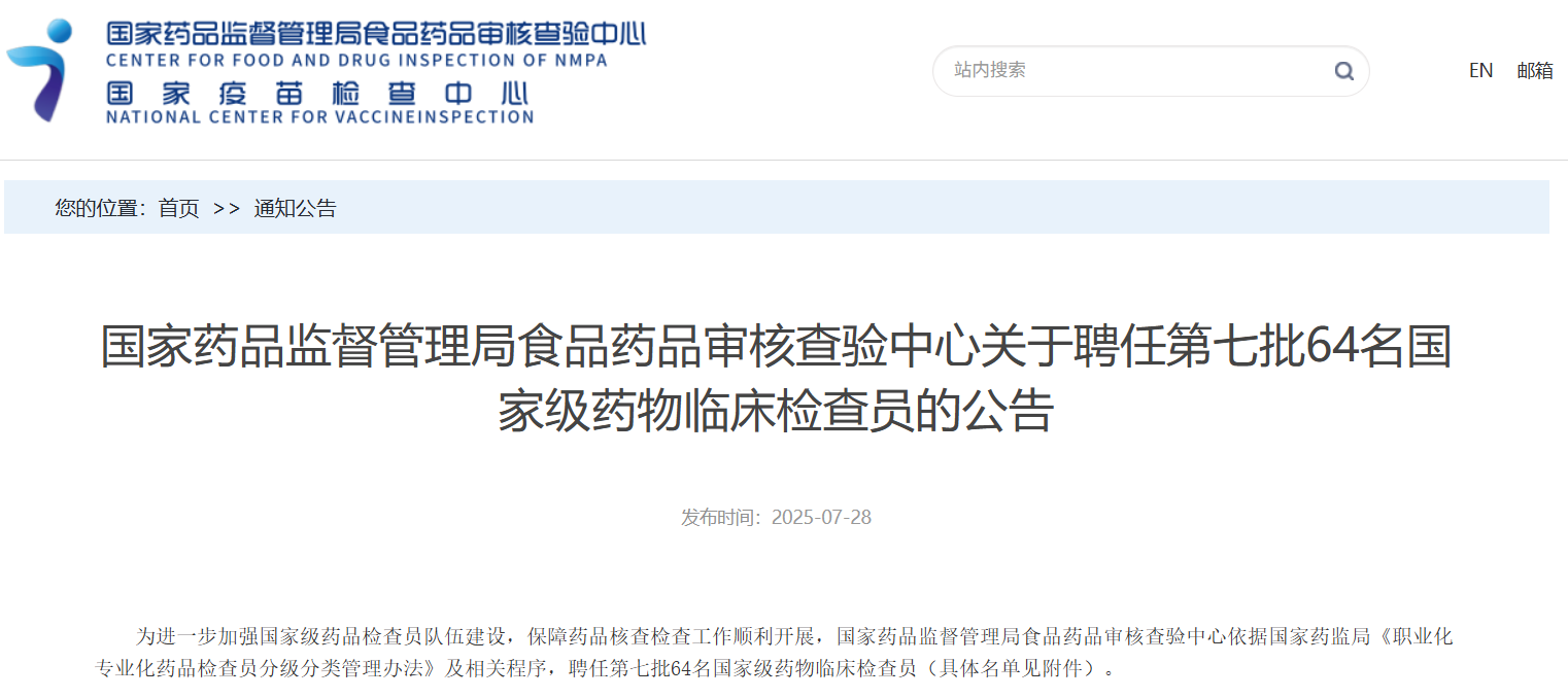 國(guó)家藥品監(jiān)督管理局食品藥品審核查驗(yàn)中心關(guān)于聘任第七批64名國(guó)家級(jí)藥物臨床檢查員的公告