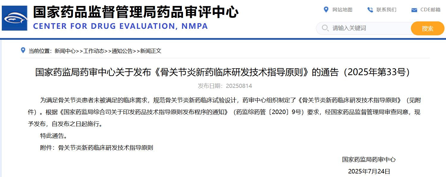 國(guó)家藥監(jiān)局藥審中心關(guān)于發(fā)布《骨關(guān)節(jié)炎新藥臨床研發(fā)技術(shù)指導(dǎo)原則》的通告(2025年第33號(hào))