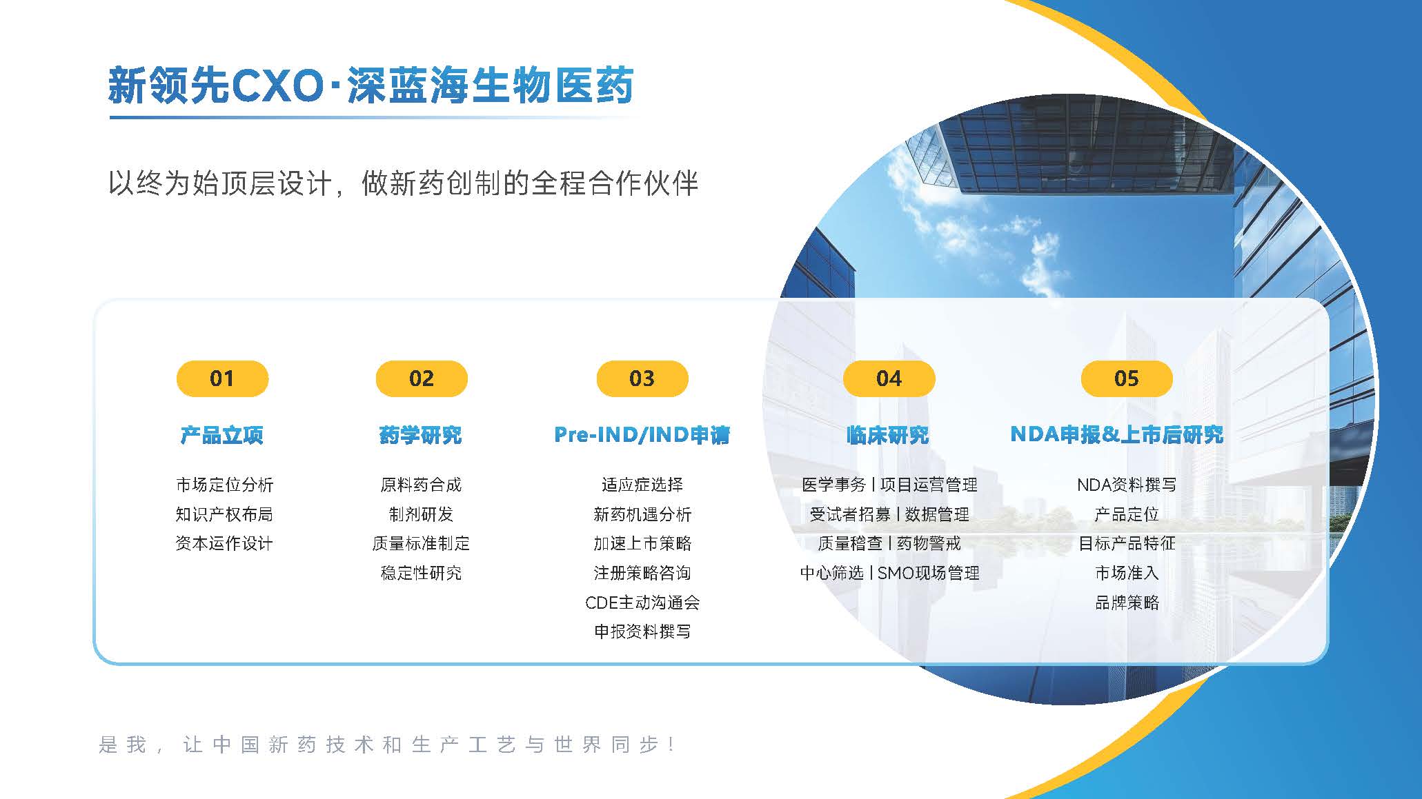 深藍(lán)海生物醫(yī)藥是新領(lǐng)先醫(yī)藥(股票代碼600222)在臨床CRO領(lǐng)域的子品牌,成立于2007年,秉持“以終為始,頂層設(shè)計(jì),做新藥創(chuàng)制的全程合作伙伴”的服務(wù)理念,為全球藥企提供覆蓋生物藥、化藥、中藥、醫(yī)療器械、細(xì)胞與基因治療等I-III期臨床研究、生物等效性研究、上市后研究、第三方稽查、IND和NDA申報(bào)以及醫(yī)學(xué)事務(wù)等服務(wù)。可滿(mǎn)足不同研發(fā)型企業(yè)的臨床研究定制需求,為國(guó)內(nèi)外客戶(hù)打通新藥上市前關(guān)鍵瓶頸。