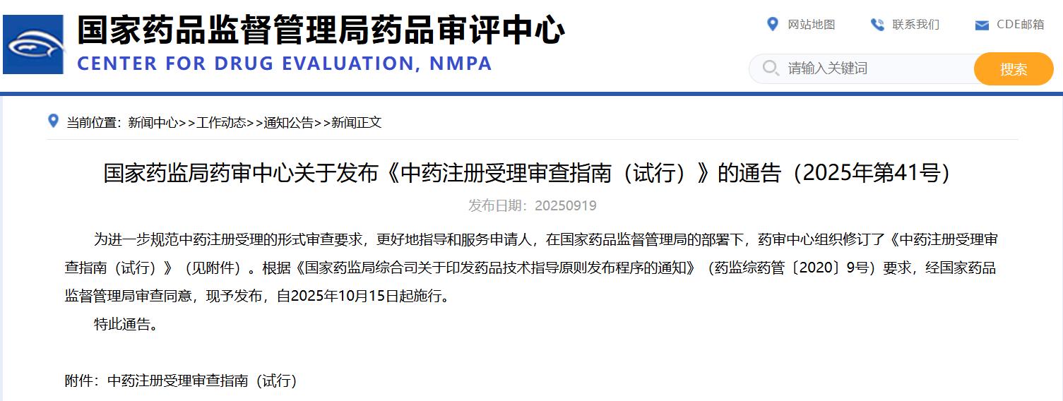 國家藥監(jiān)局藥審中心關(guān)于發(fā)布《中藥注冊受理審查指南(試行)》的通告(2025年第41號)