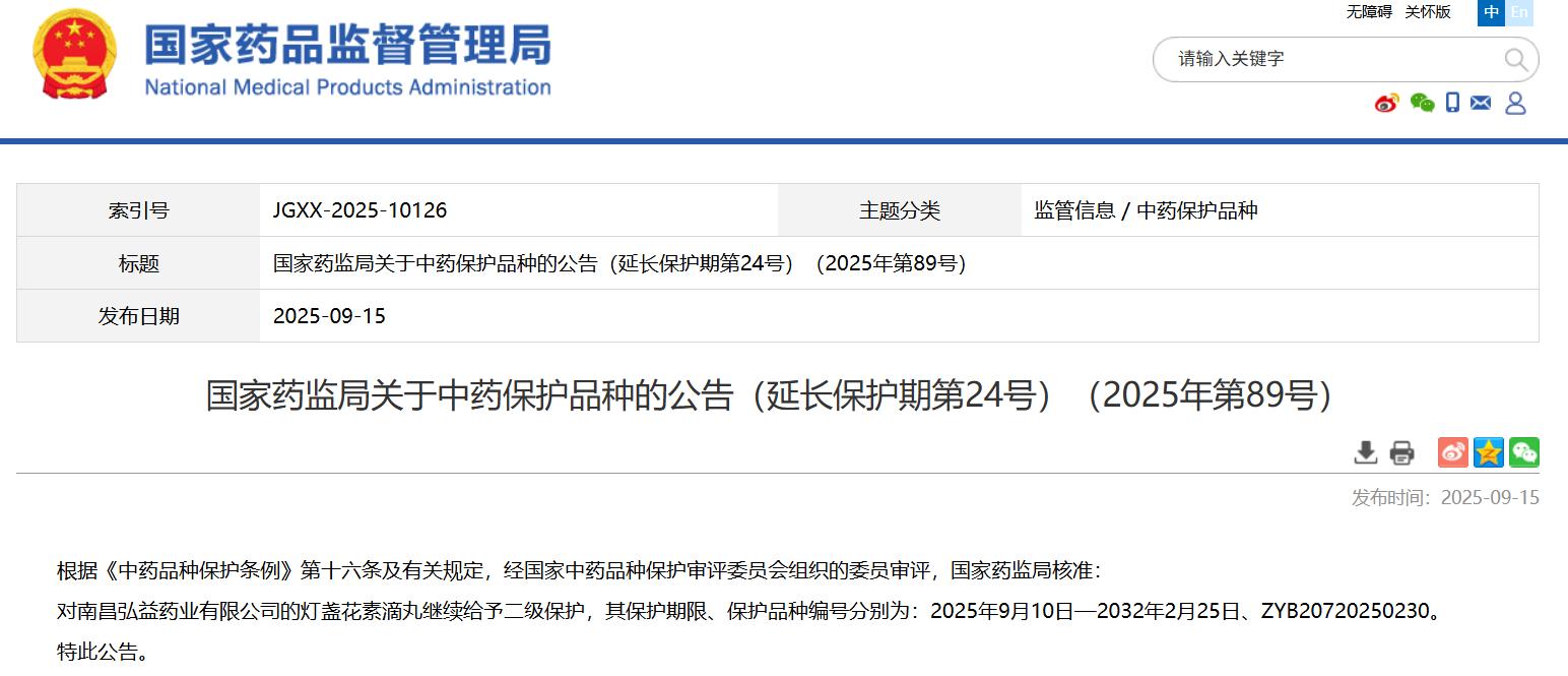 國家藥監(jiān)局關(guān)于中藥保護(hù)品種的公告(延長保護(hù)期第24號)(2025年第89號)