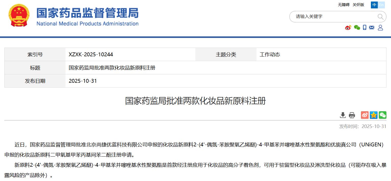 國家藥監(jiān)局批準(zhǔn)兩款化妝品新原料注冊