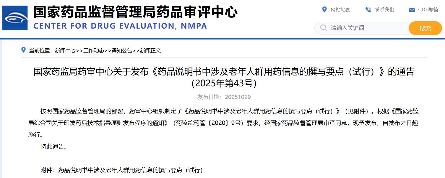 國家藥監(jiān)局藥審中心關(guān)于發(fā)布《藥品說明書中涉及老年人群用藥信息的撰寫要點(diǎn)(試行)》的通告(2025年第43號)