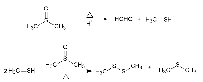 查詢二甲基亞砜穩(wěn)定性相關(guān)文獻,報道二甲基亞砜在酸性條件下高溫加熱會發(fā)生分解,分解產(chǎn)物主要是甲硫醚(沸點38℃)、二甲基二硫醚(沸點109℃)和甲硫醇(沸點123℃)。