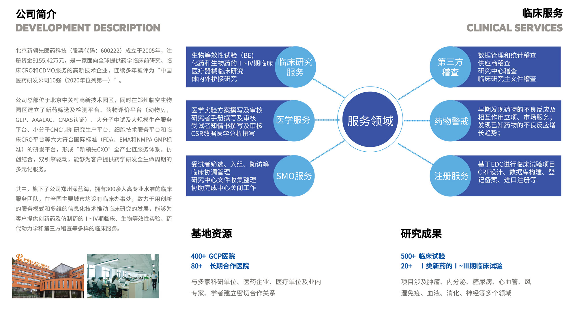 北京新領(lǐng)先(股票代碼:600222)成立于2005年,注冊(cè)資金9155.42萬元,是一家面向全球提供藥學(xué)臨床前研究、臨床CRO和CDMO服務(wù)的高新技術(shù)企業(yè),連續(xù)多年被評(píng)為“中國醫(yī)藥研發(fā)公司10強(qiáng)(2020年位列第一)”。公司總部位于北京中關(guān)村高新技術(shù)園區(qū),同時(shí)在鄭州臨空生物園區(qū)建立了新藥篩選及檢測(cè)平臺(tái)、藥物評(píng)價(jià)平臺(tái)(動(dòng)物房,GLP、AAALAC、CNAS認(rèn)證)、大分子中試及大規(guī)模生產(chǎn)服務(wù)平臺(tái)、小分子CMC制劑研究生產(chǎn)平臺(tái)、細(xì)胞技術(shù)服務(wù)平臺(tái)和臨床CRO平臺(tái)等六大符合國際標(biāo)準(zhǔn)(FDA、EMA和NMPA GMP標(biāo)準(zhǔn))的研發(fā)平臺(tái),形成“新領(lǐng)先CXO”全產(chǎn)業(yè)鏈服務(wù)體系。仿創(chuàng)結(jié)合,雙引擎驅(qū)動(dòng),能夠?yàn)榭蛻籼峁┧帉W(xué)研發(fā)全生命周期的多元化服務(wù)。
