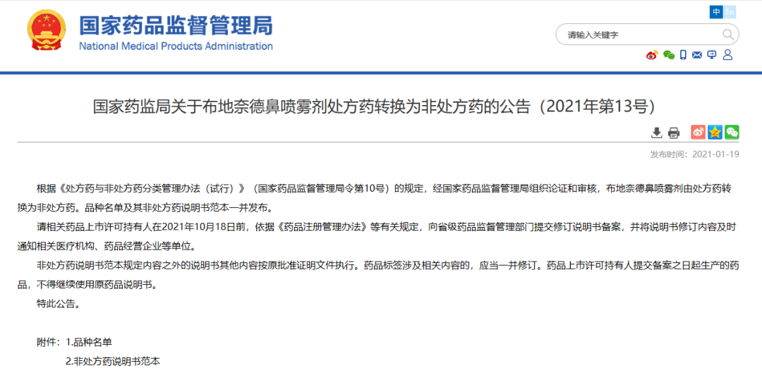 關(guān)于布地奈德鼻噴霧劑處方藥轉(zhuǎn)換為非處方藥的公告(2021年第13號)