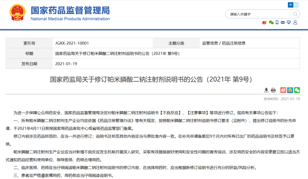 關(guān)于修訂帕米膦酸二鈉注射劑說明書的公告(2021年 第9號)