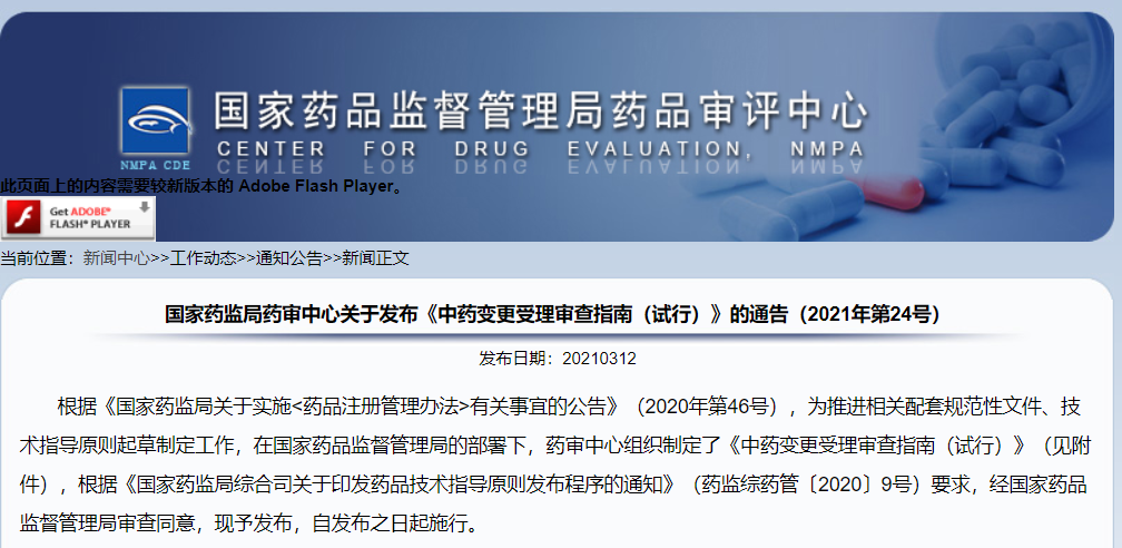 國(guó)家藥監(jiān)局藥審中心關(guān)于發(fā)布《中藥變更受理審查指南(試行)》的通告(2021年第24號(hào))
