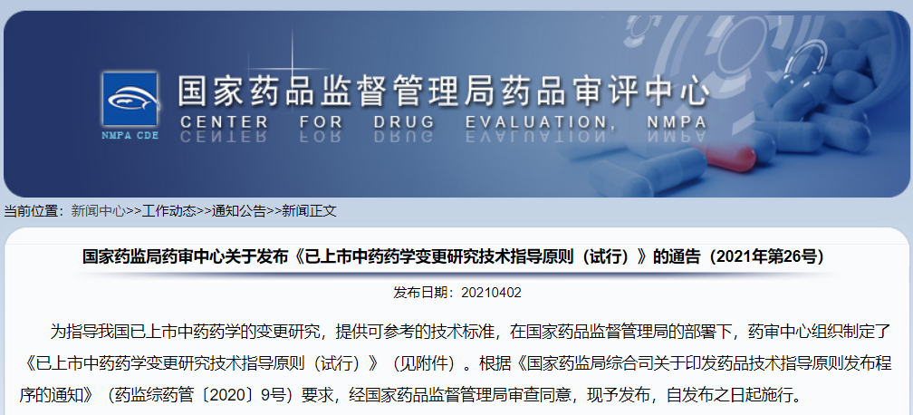 國家藥監(jiān)局藥審中心關(guān)于發(fā)布《已上市中藥藥學(xué)變更研究技術(shù)指導(dǎo)原則(試行)》的通告(2021年第26號)