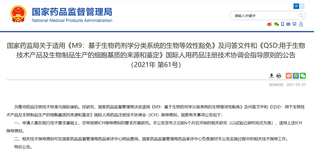 關(guān)于適用《M9:基于生物藥劑學(xué)分類系統(tǒng)的生物等效性豁免》及問(wèn)答文件和《Q5D:用于生物技術(shù)產(chǎn)品及生物制品生產(chǎn)的細(xì)胞基質(zhì)的來(lái)源和鑒定》國(guó)際人用藥品注冊(cè)技術(shù)協(xié)調(diào)會(huì)指導(dǎo)原則的公告(2021年 第61號(hào))