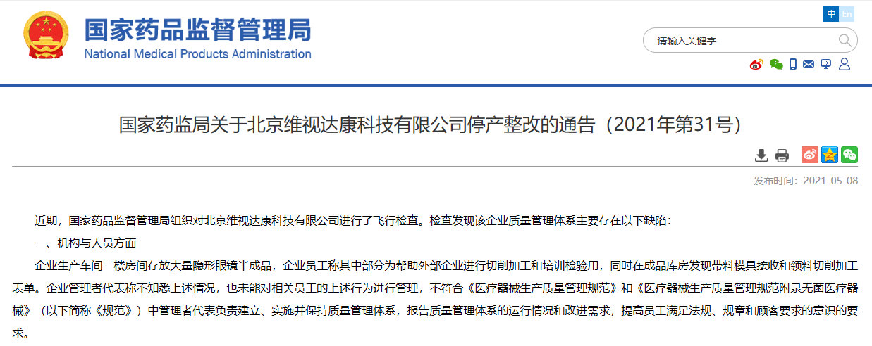 關(guān)于北京維視達(dá)康科技有限公司停產(chǎn)整改的通告(2021年第31號(hào))