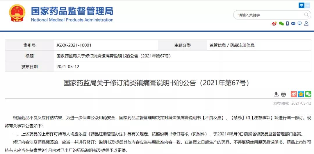 國家藥監(jiān)局關(guān)于修訂消炎鎮(zhèn)痛膏說明書的公告(2021年第67號)