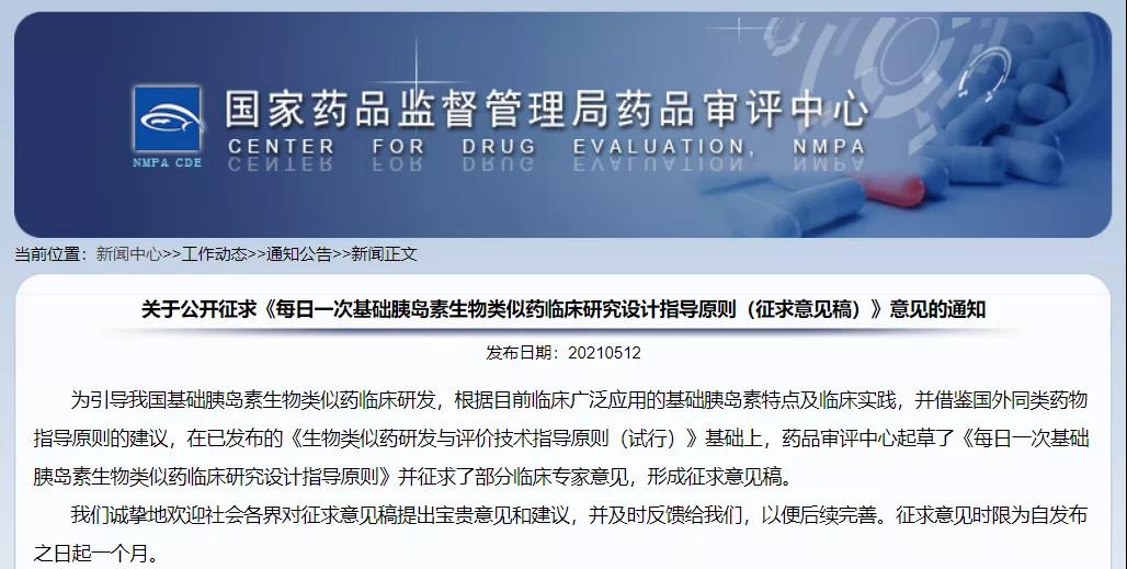關(guān)于公開征求《每日一次基礎(chǔ)胰島素生物類似藥臨床研究設(shè)計指導原則(征求意見稿)》意見的通知