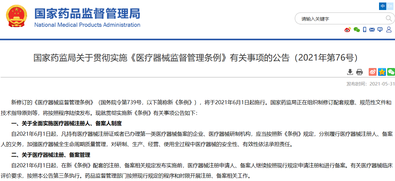 國家藥監(jiān)局關(guān)于貫徹實(shí)施《醫(yī)療器械監(jiān)督管理條例》有關(guān)事項的公告(2021年第76號)