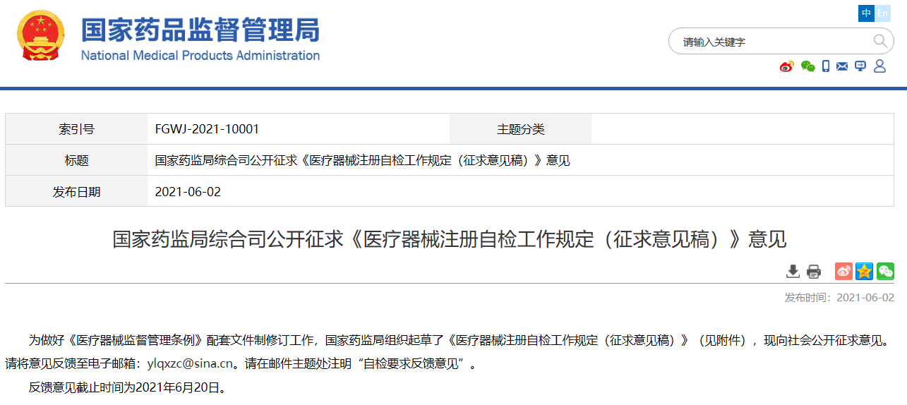 國家藥監(jiān)局綜合司公開征求《醫(yī)療器械注冊自檢工作規(guī)定(征求意見稿)》意見