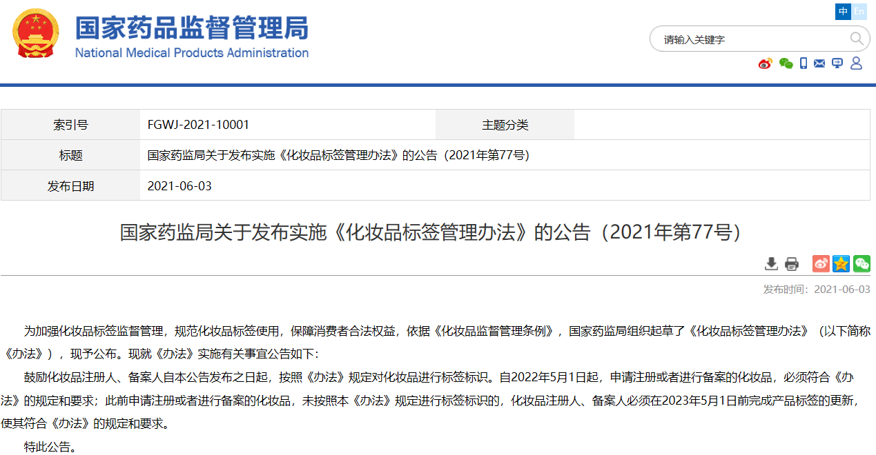 國家藥監(jiān)局關(guān)于發(fā)布實(shí)施《化妝品標(biāo)簽管理辦法》的公告(2021年第77號)