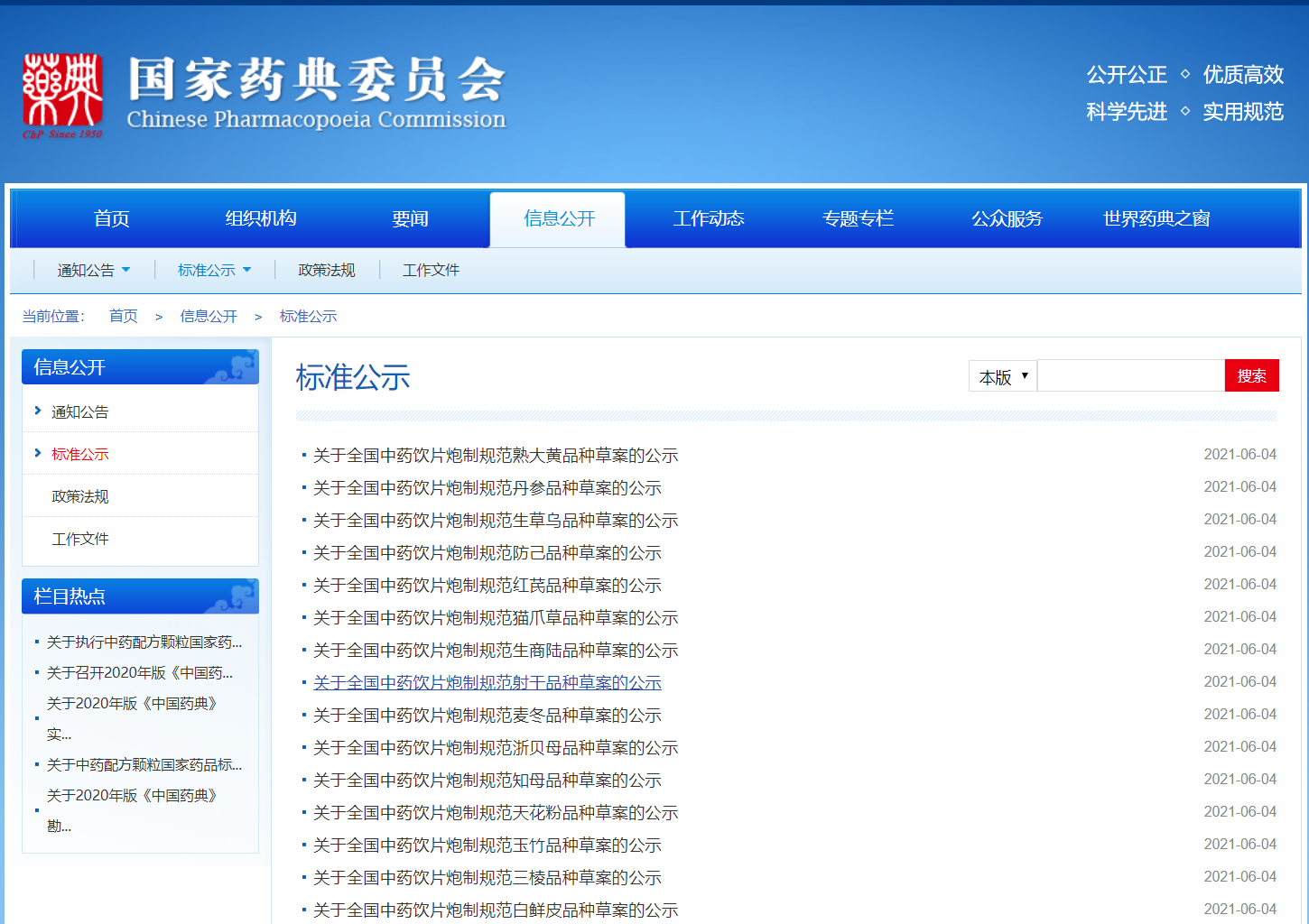本周全國中藥飲片炮制規(guī)范熟大黃品種、全國中藥飲片炮制規(guī)范丹參品種、全國中藥飲片炮制規(guī)范生草烏品種、全國中藥飲片炮制規(guī)范防己品種、全國中藥飲片炮制規(guī)范紅芪品種、全國中藥飲片炮制規(guī)范貓爪草品種、全國中藥飲片炮制規(guī)范生商陸品種、全國中藥飲片炮制規(guī)范射干品種、全國中藥飲片炮制規(guī)范麥冬品種、全國中藥飲片炮制規(guī)范浙貝母品種、全國中藥飲片炮制規(guī)范知母品種、全國中藥飲片炮制規(guī)范天花粉品種、全國中藥飲片炮制規(guī)范玉竹品種、全國中藥飲片炮制規(guī)范三棱品種、全國中藥飲片炮制規(guī)范白鮮皮品種、全國中藥飲片炮制規(guī)范白茅根品種、全國中藥飲片炮制規(guī)范酒白芍品種、全國中藥飲片炮制規(guī)范炒白芍品種、全國中藥飲片炮制規(guī)范白芍品種、全國中藥飲片炮制規(guī)范皂角刺品種、全國中藥飲片炮制規(guī)范赤石脂品種、全國中藥飲片炮制規(guī)范肉蓯蓉品種草案公示;阿莫西林顆粒國家、碳酸鋰緩釋片、碳酸鋰片、混合核苷片、混合核苷國家藥品標(biāo)準(zhǔn)草案公示;混合脂肪酸甘油酯(硬脂)、硬脂酸鈣藥用輔料標(biāo)準(zhǔn)草案公示。