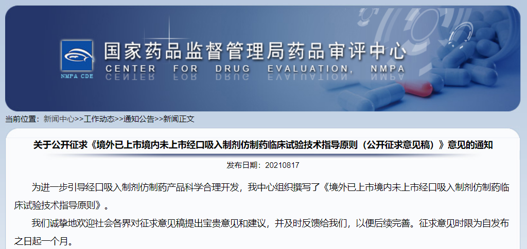關于公開征求《境外已上市境內未上市經口吸入制劑仿制藥臨床試驗技術指導原則(公開征求意見稿)》意見的通知
