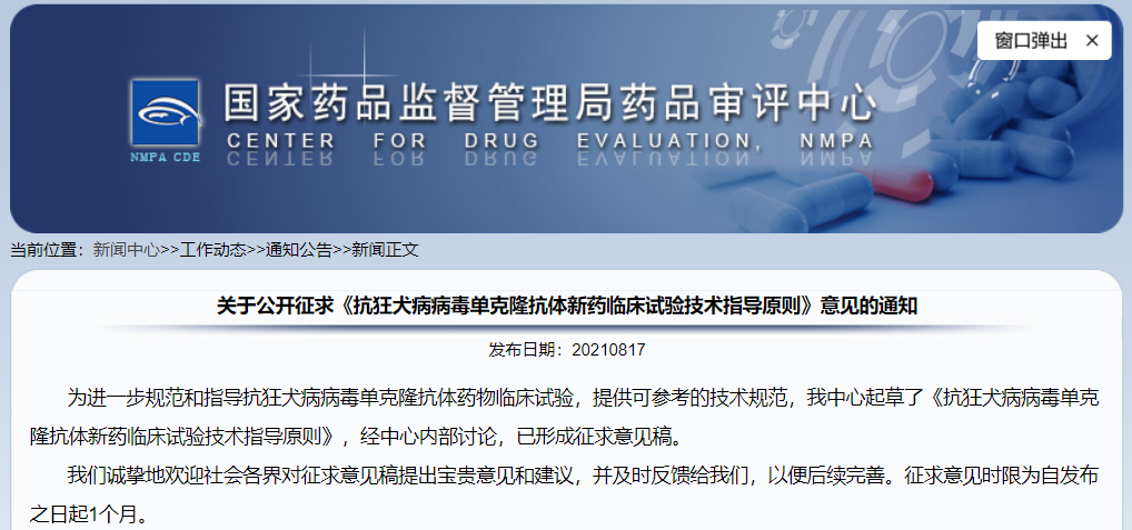 關于公開征求《抗狂犬病病毒單克隆抗體新藥臨床試驗技術指導原則》意見的通知