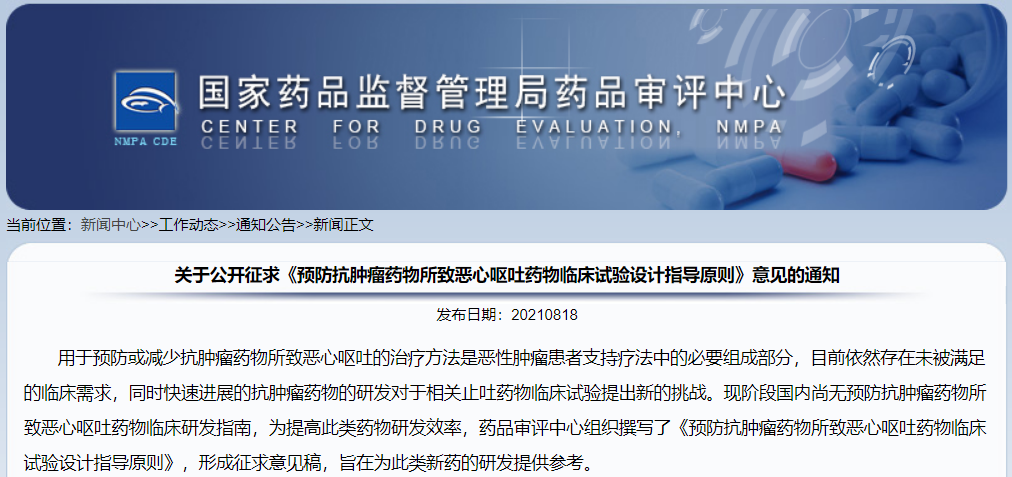 關于公開征求《預防抗腫瘤藥物所致惡心嘔吐藥物臨床試驗設計指導原則》意見的通知