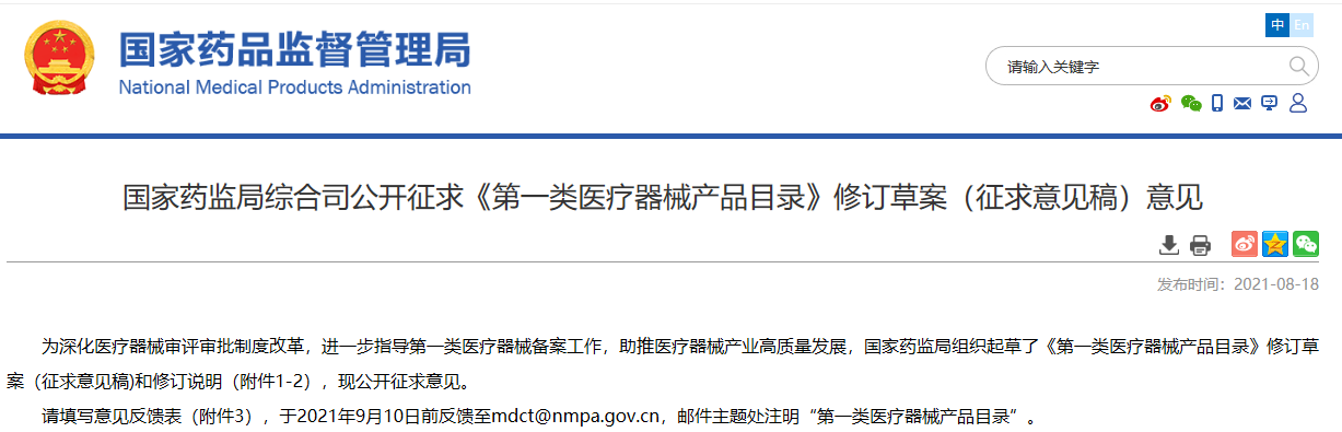 國家藥監(jiān)局綜合司公開征求《第一類醫(yī)療器械產品目錄》修訂草案(征求意見稿)意見