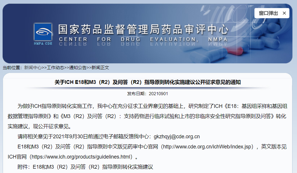 關(guān)于ICH E18和M3(R2)及問答(R2)指導原則轉(zhuǎn)化實施建議公開征求意見的通知