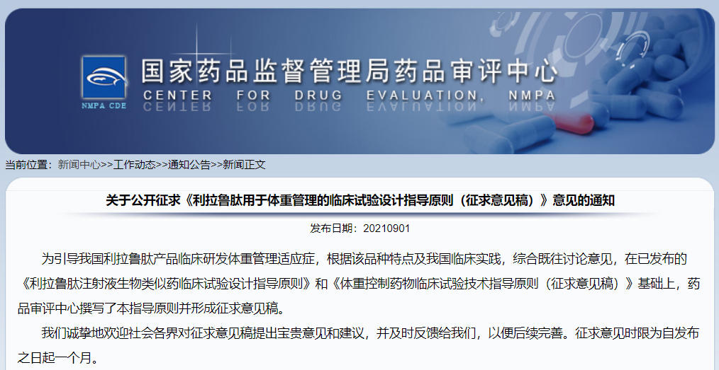 關(guān)于公開征求《利拉魯肽用于體重管理的臨床試驗設(shè)計指導原則(征求意見稿)》意見的通知