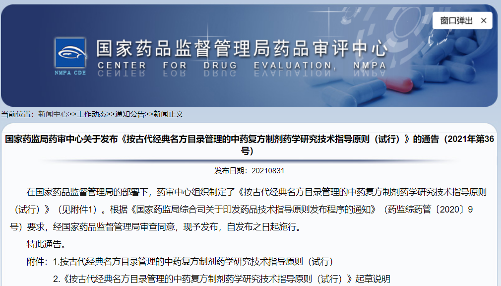 關(guān)于發(fā)布《按古代經(jīng)典名方目錄管理的中藥復方制劑藥學研究技術(shù)指導原則(試行)》的通告(2021年第36號)