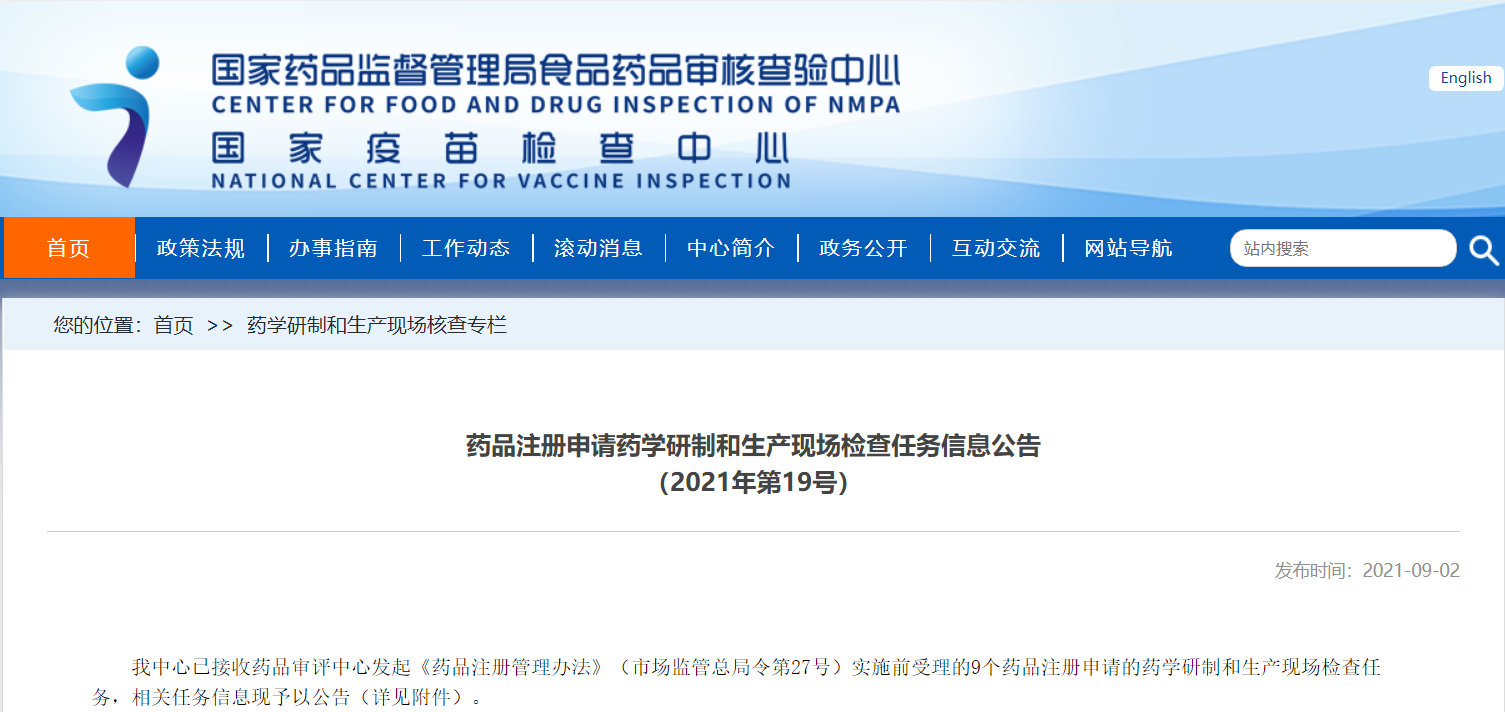 藥品注冊申請藥學研制和生產(chǎn)現(xiàn)場檢查任務(wù)信息公告(2021年第19號)