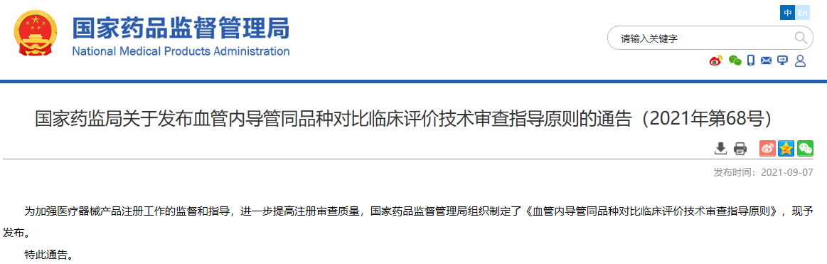 關于發(fā)布血管內(nèi)導管同品種對比臨床評價技術審查指導原則的通告(2021年第68號)