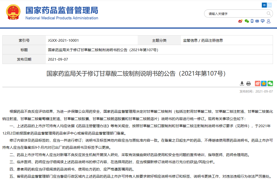 國家藥監(jiān)局關于修訂甘草酸二銨制劑說明書的公告(2021年第107號)