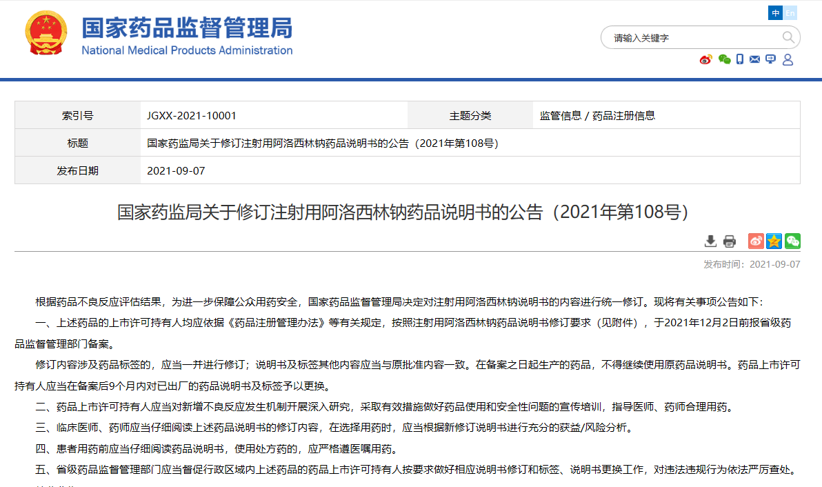 國家藥監(jiān)局關于修訂注射用阿洛西林鈉藥品說明書的公告(2021年第108號)
