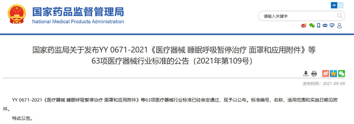 國家藥監(jiān)局關于發(fā)布YY 0671-2021《醫(yī)療器械 睡眠呼吸暫停治療 面罩和應用附件》等63項醫(yī)療器械行業(yè)標準的公告(2021年第109號)