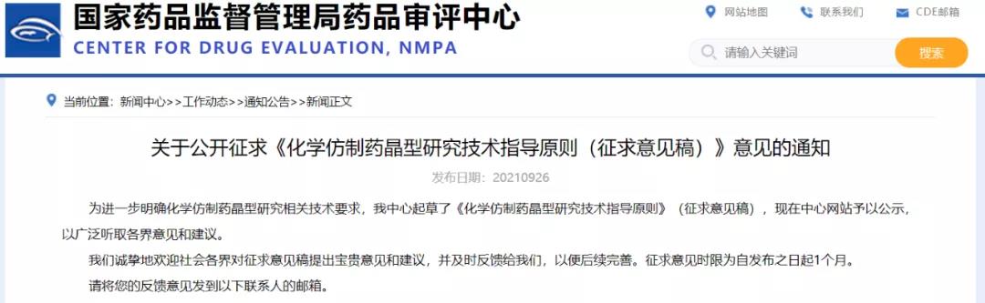 關(guān)于公開征求《化學(xué)仿制藥晶型研究技術(shù)指導(dǎo)原則(征求意見稿)》意見的通知