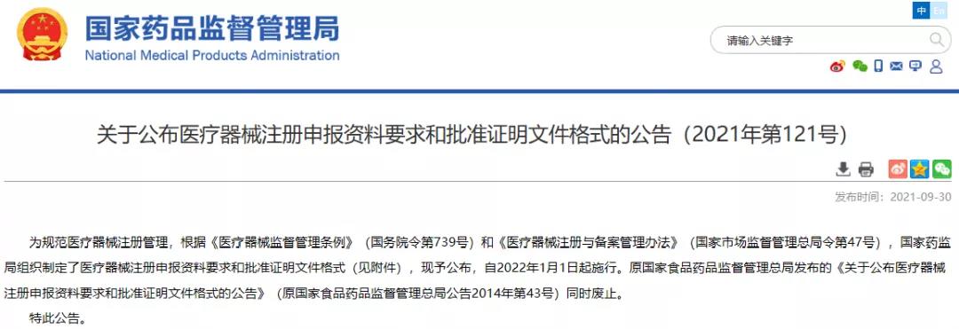 關(guān)于公布醫(yī)療器械注冊申報資料要求和批準證明文件格式的公告(2021年第121號)