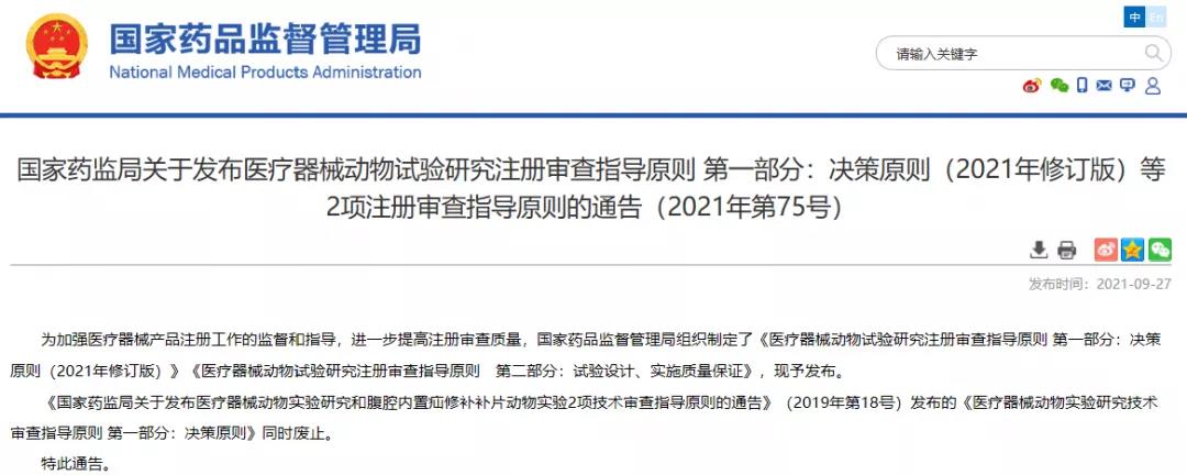 國家藥監(jiān)局關(guān)于發(fā)布醫(yī)療器械動物試驗研究注冊審查指導(dǎo)原則 第一部分:決策原則(2021年修訂版)等2項注冊審查指導(dǎo)原則的通告(2021年第75號)