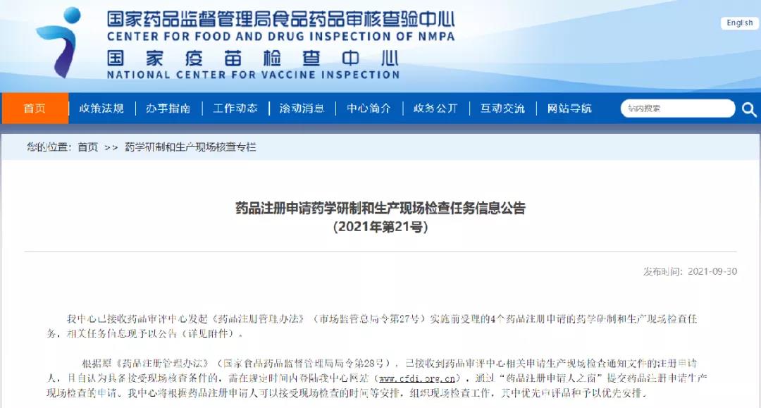 藥品注冊申請藥學(xué)研制和生產(chǎn)現(xiàn)場檢查任務(wù)信息公告(2021年第21號)