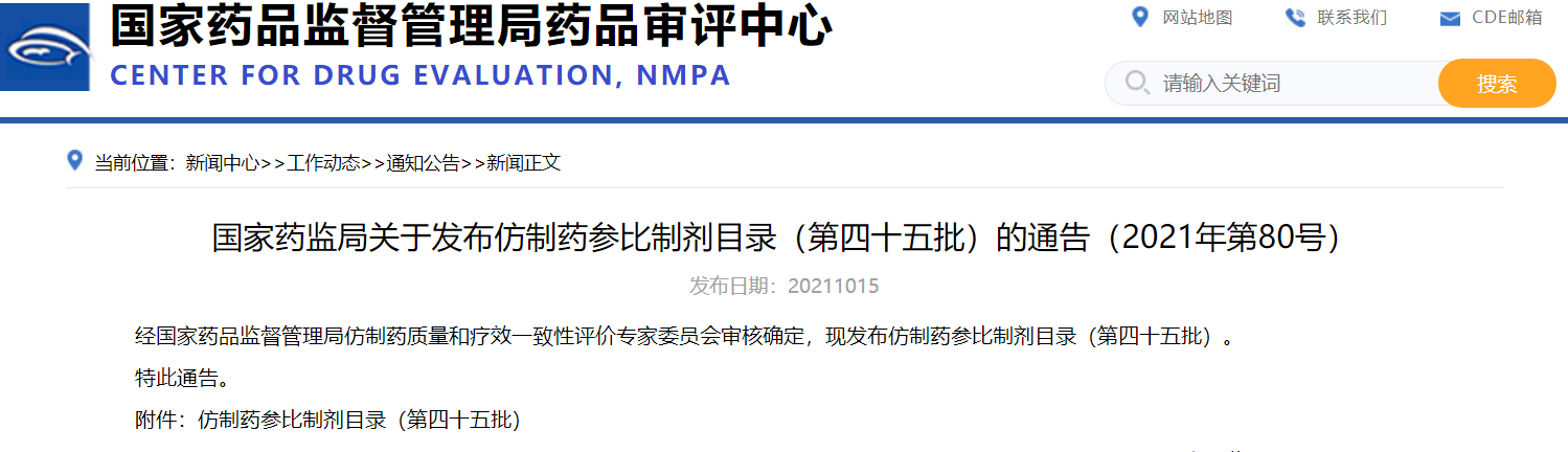 國家藥監(jiān)局關(guān)于發(fā)布仿制藥參比制劑目錄(第四十五批)的通告(2021年第80號)