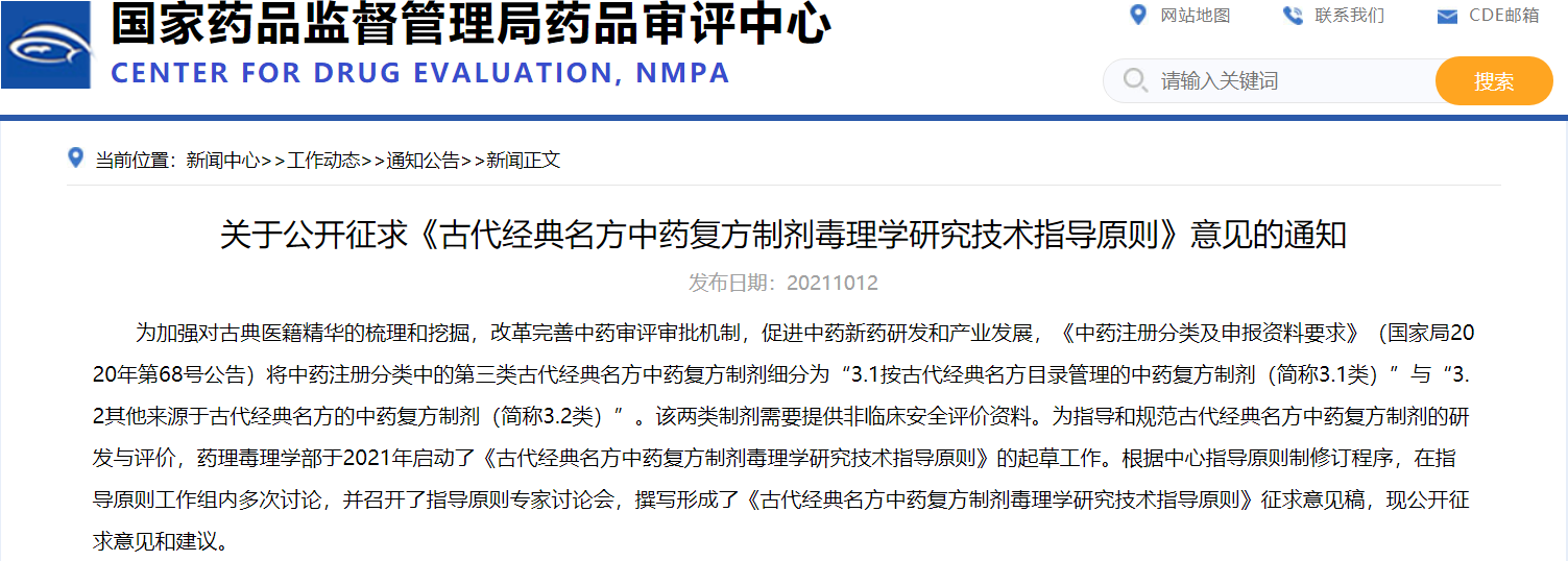 關(guān)于公開征求《古代經(jīng)典名方中藥復(fù)方制劑毒理學(xué)研究技術(shù)指導(dǎo)原則》意見的通知