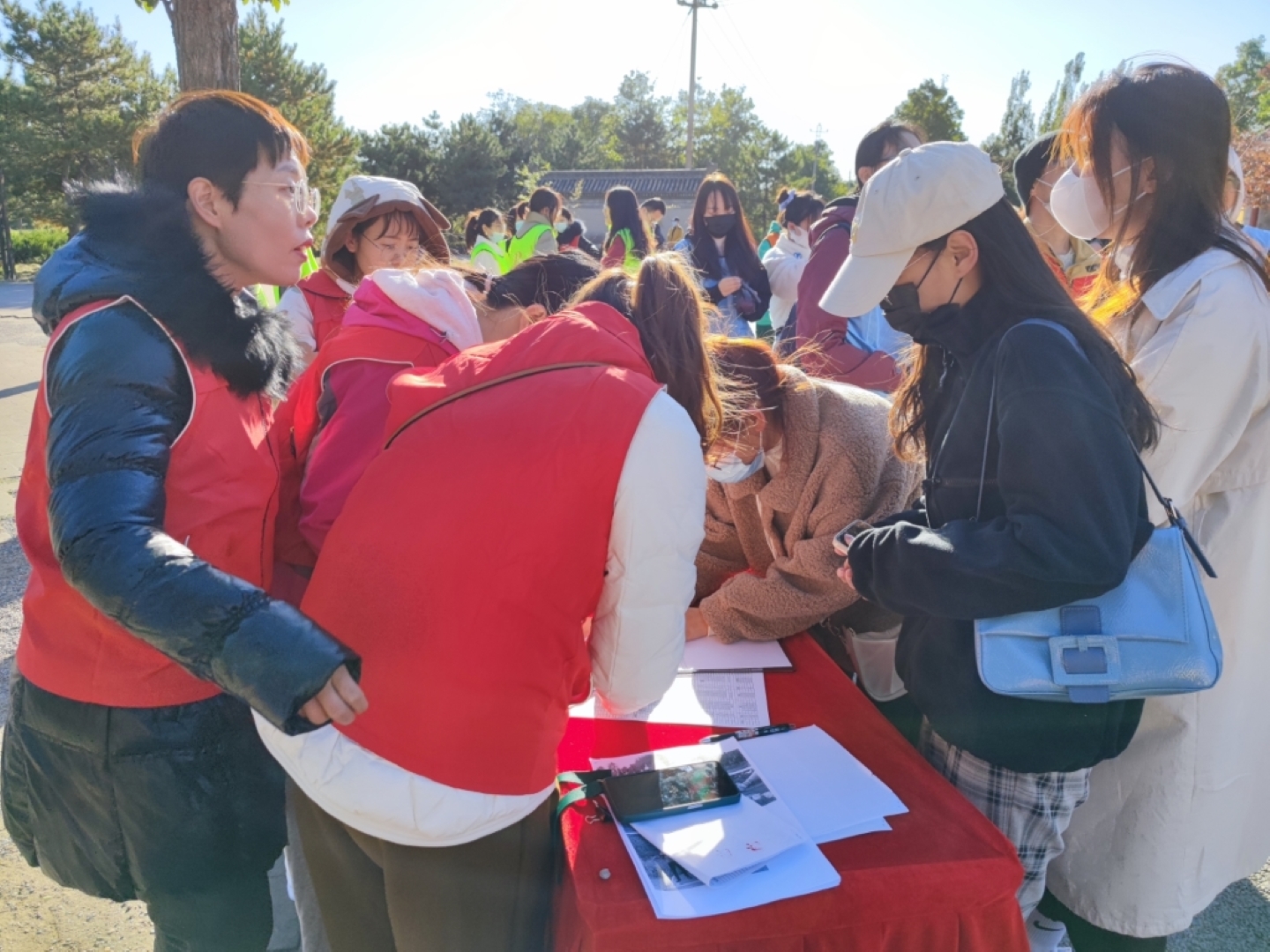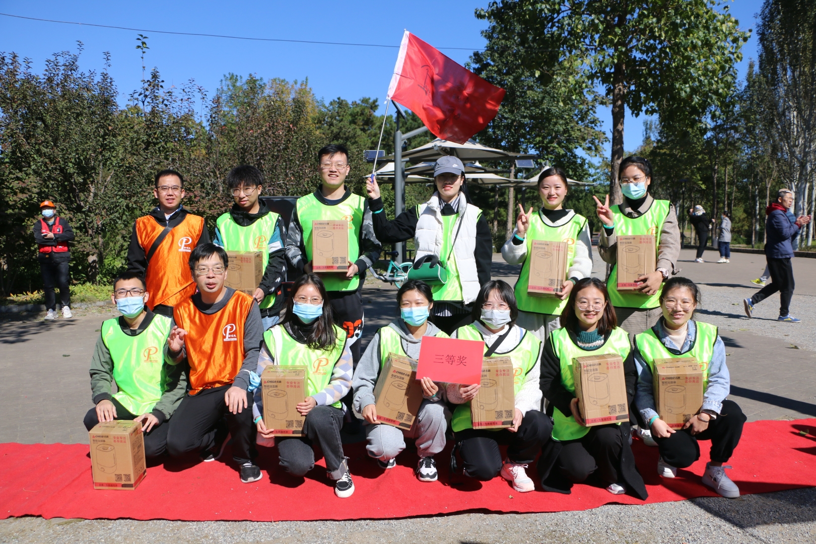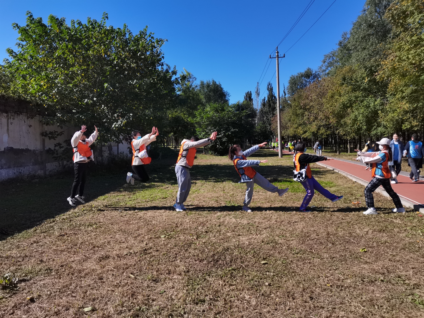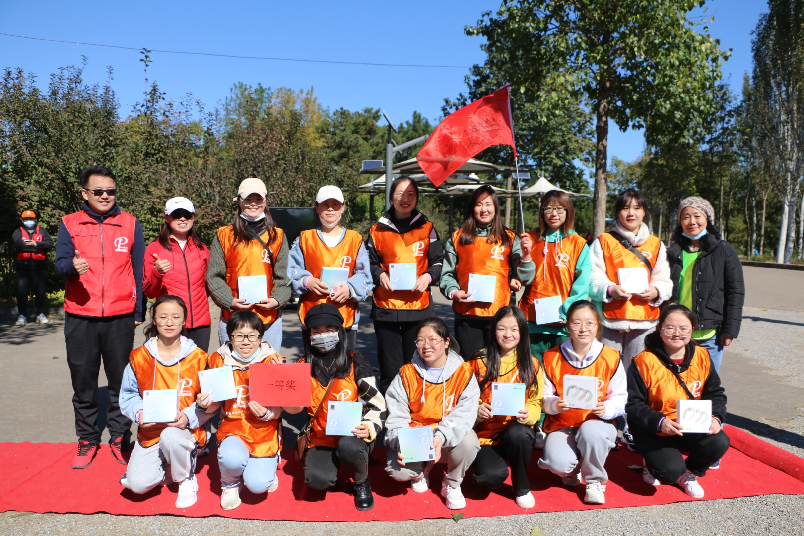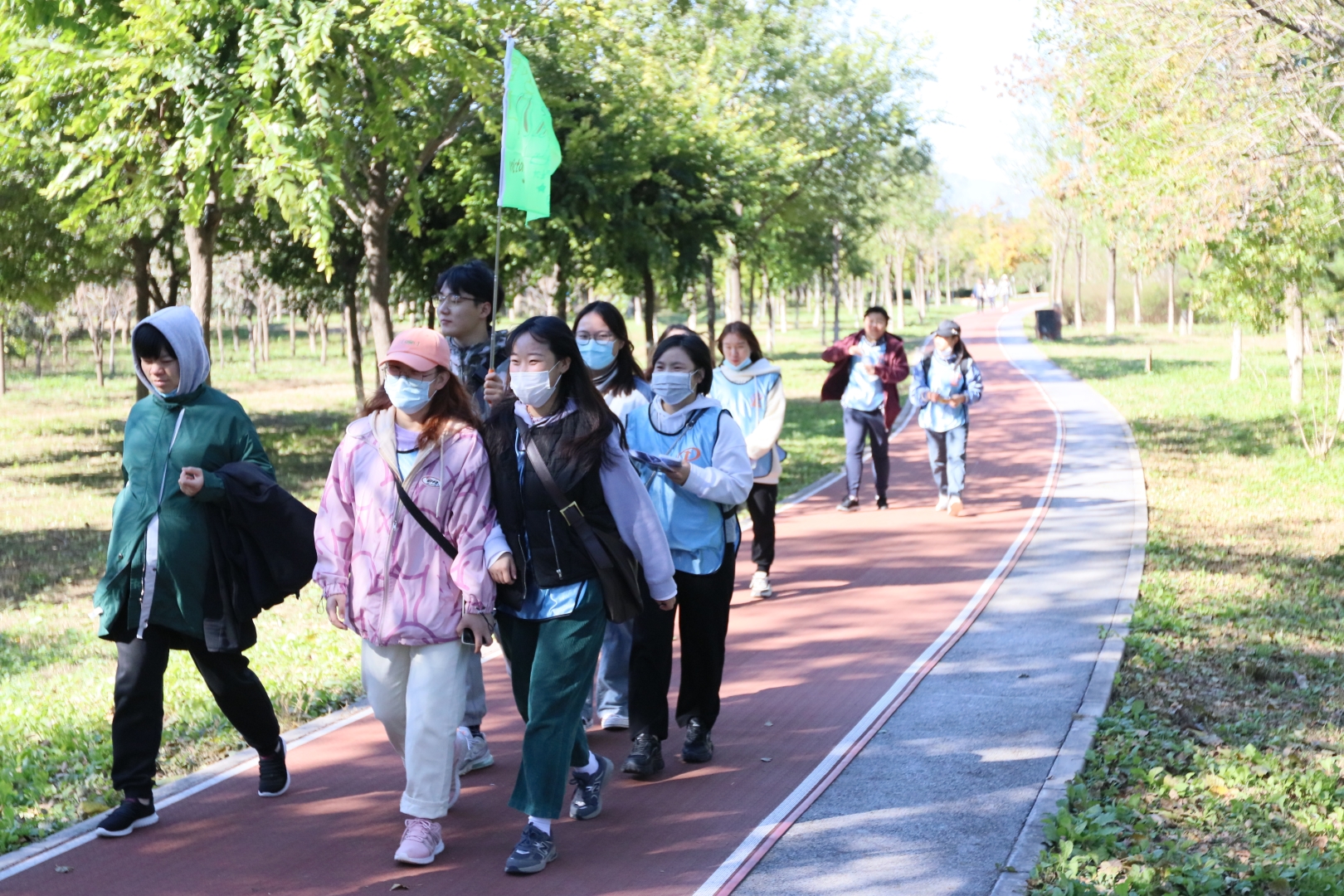 ▲各隊隊員高舉隊旗,耳聽秋風(fēng),腳踩落葉,有說有笑,相伴同行
