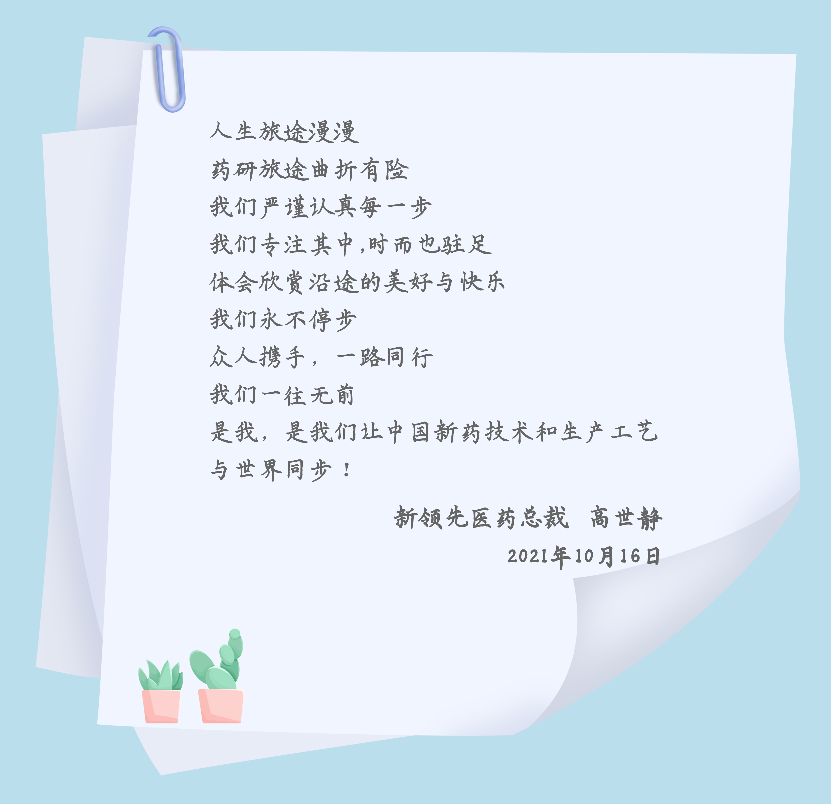 我們從事的是醫(yī)藥健康事業(yè),更要有健康的體魄和精神,新領(lǐng)先人始終秉承越山向海的精神,在藥品研發(fā)過程中堅韌不拔、攻堅克難,向著目標(biāo),一往無前,為健康中國戰(zhàn)略貢獻(xiàn)自己的力量;同時,我們也希望通過本次徒步活動,鼓勵大家親近自然,強健體魄,以積極、陽光、向上的心態(tài)面對生活,面對工作,讓我們一起做“體面的新領(lǐng)先人”!