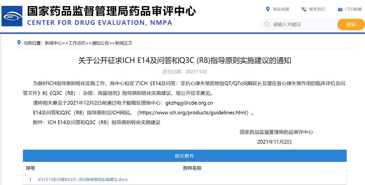 關(guān)于公開(kāi)征求ICH E14及問(wèn)答和Q3C (R8)指導(dǎo)原則實(shí)施建議的通知
